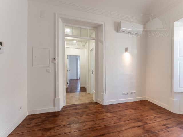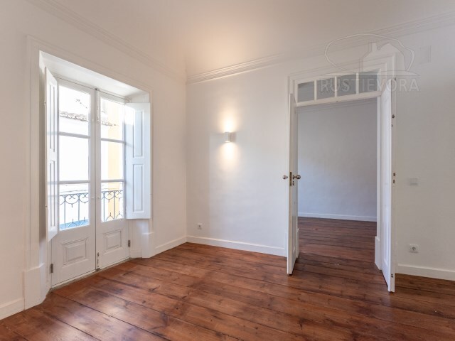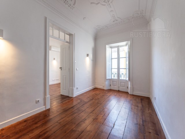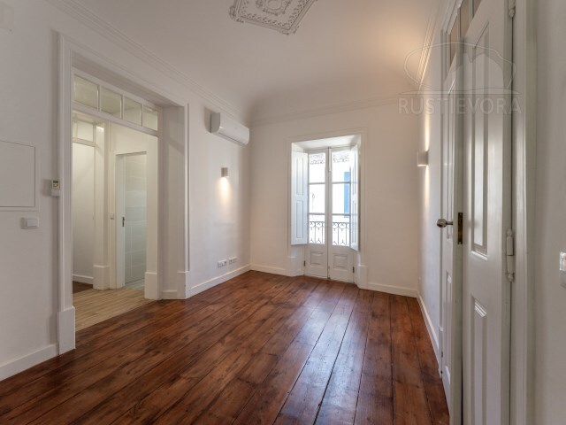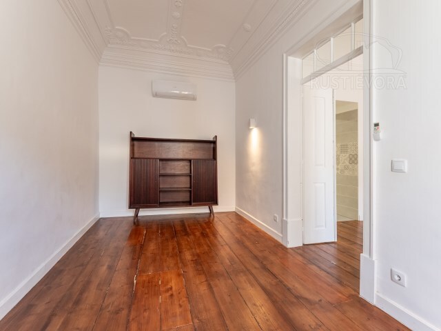 Apartamento de 1º andar, composto por 4 assoalhadas, grande cozinha totalmente equipada, despensa, suite, 2ª casa de banho com duche e janela, grandes arrumos, ar condicionado em todas as divisões, de gaveto para duas ruas, localizada em pleno centro histórico, em rua de lojas de comércio tradicional.