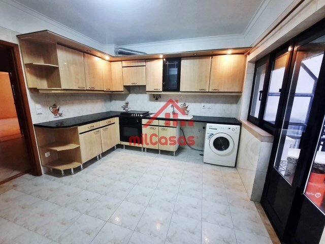 Cozinha equipada com placa, forno, esquentador, máquina lavar roupa e combinado.
