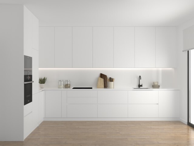 Uma cozinha equipada com placa vitrocerâmica, forno, exaustor e micro-ondas, armários em termolaminado, bancadas em granito e iluminação led