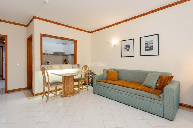 O apartamento conta com uma sala ampla e kitchenette. A varanda espaçosa proporciona um agradável espaço exterior para refeições ao ar livre ou para simplesmente desfrutar do sol.