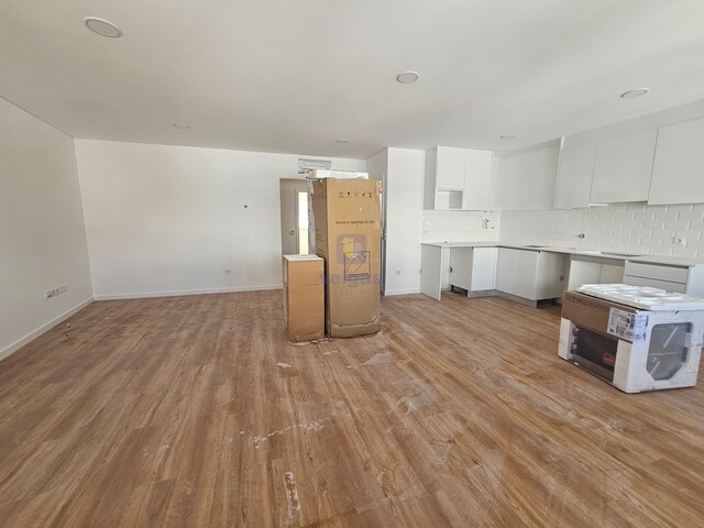 - Cozinha com móveis lacados a branco e bancada com acabamento a madeira natural de Carvalho;