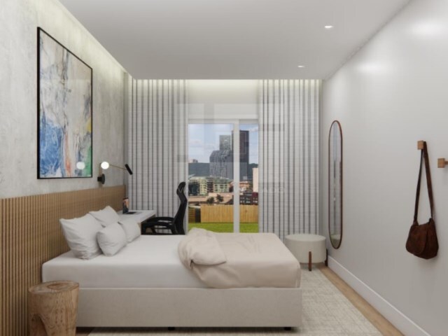 Suite com 15m², casa de banho privativa com 5m², janela e acabamentos modernos.