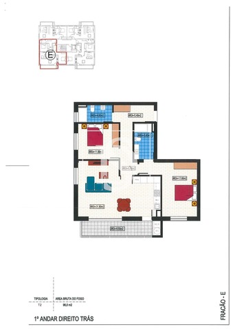 Com cerca de 96 m² de área bruta, a Fração E apresenta uma distribuição equilibrada entre a zona social e a área privada.