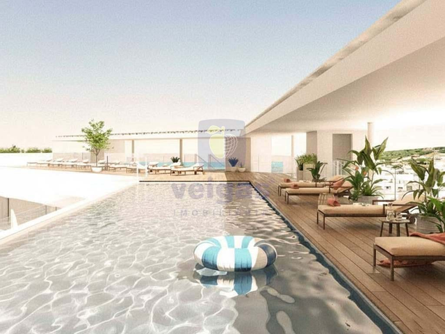 Na cobertura do edifício existe um terraço comum destinado a lazer e solário, mobilado com piscina comum e pala de ensombramento com vista para a praia.