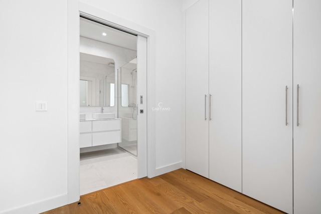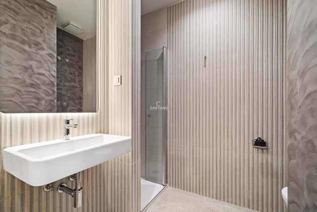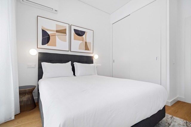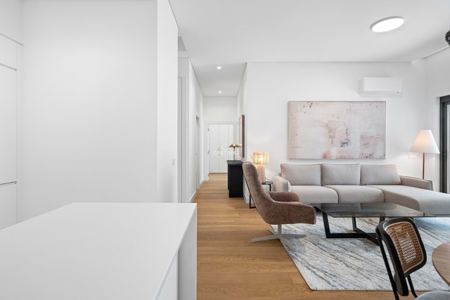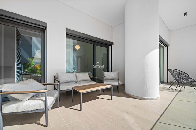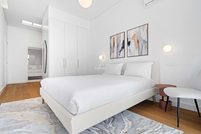 O apartamento é vendido totalmente mobilado, com interiores modernos e acabamentos de alta qualidade. O quarto principal dispõe de casa de banho privativa, garantindo todo o conforto e privacidade. O edifício foi concluído no início de 2025, pelo que terá a oportunidade de viver num imóvel completamente novo, pronto a estrear.