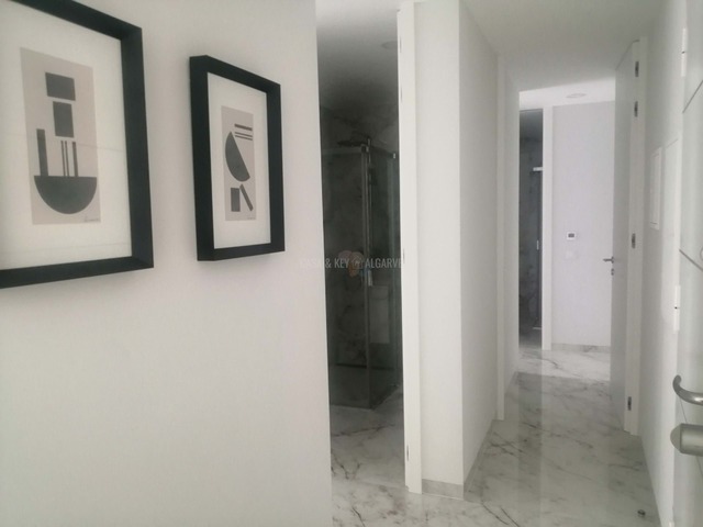 A cozinha elegante vem totalmente equipada com eletrodomésticos de última geração, integrando-se perfeitamente à área de estar para criar um espaço luminoso e convidativo. Ambos os quartos são de dimensões generosas, com roupeiros embutidos e acesso direto a uma varanda privada, onde pode aproveitar o sol do Algarve. A casa de banho moderna possui acessórios premium, realçando a sensação de luxo deste apartamento novo no Algarve.