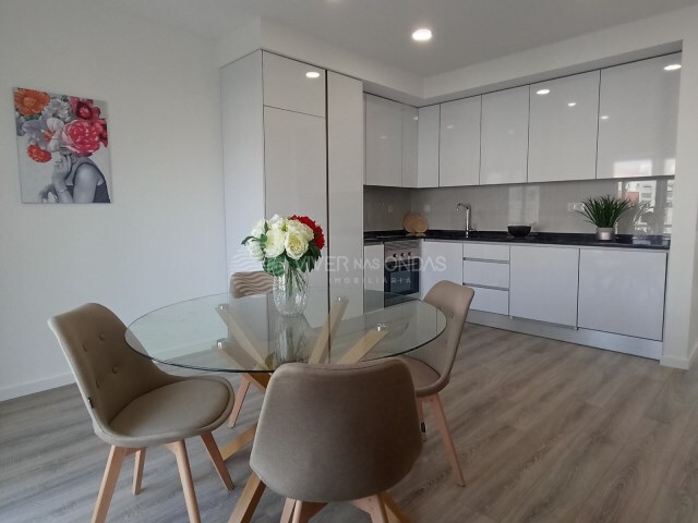 Composto por cozinha + sala c/ 43m2 e acesso a varanda aberta. A cozinha tem móveis em branco, ladrilho em toda a parede por trás dos móveis, forno, placa, exaustor, microondas, máquina de lavar louça e máquina de lavar roupa encastradas, termo acumulador e combinado encastrado. Wc completo c/ 3m2 com loiças suspensas, 3 quartos, o primeiro c/ 15m2, roupeiro e varanda, o segundo c/ 15m2 e roupeiro e o terceiro é suite c/ 20m2 e roupeiro.