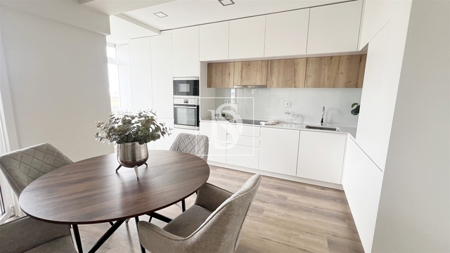 O imóvel destaca-se pela sua luminosidade e funcionalidade, com cozinha em open space de 12,33 m², totalmente equipada com eletrodomésticos encastrados e móveis lacados a branco, complementada por um revestimento em ladrilho que confere um toque contemporâneo. A sala integra harmoniosamente este espaço, proporcionando um ambiente amplo e acolhedor.