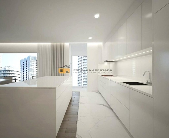 Apartamento T 3 - NOVO Área 143,73 m2 + Box fechada, com 53,13 m2, para 2 carros + Terraço com 33,19 m2 Ficará concluído no decurso do 1º Semestre de 2027Revestimentos Exteriores do edifícioFachada - Sistema ETIC'S, Pintado de Branco + Alucobond cor Noir 200Caixilharia de alumínio, com corte térmico, na cor Noir Sable 200 exterior, e branco no interior, e com vidro duploCaixilharia de alumínio extrudido ou PVC e poliamida em polímero, aplicada na face interior, por forma a melhorar o desempenho acústico e térmico na habitação, de cor preta pelo exterior e branca pelo interiorVidros duplos térmicosInterioresPortas de entrada de segurança, com acabamento lacado pelo interior e madeira a definir pelo exteriorTeto em gesso cartonado hidrófugo em zonas húmidas como cozinhas e casas de banho e gesso cartonado normal nas restantes zonasParedes interiores e forra de paredes exteriores em divisórias em gesso cartonado 'standard' com 13mm de espessura, incluindo estrutura de suporte e fixação composta por montantes afastados de 600mm, isolamento em lãEstores elétricos, em alumínio termolacado e isolado termicamente com uma densidade de 75.5 kg/m3 e lamina de 4.5cm.Ar-CondicionadoLouças sanitáriasSanita e bidé suspenso, cor brancaBase de duche cor branca.KIT encastre de base de duche, da marca AAMTorneira Monocomando de lavatório, marca AAMResguardo na base de ducheMóvel de banho WC ComumCozinhasMóveis de cozinha com ilha, em modulação melamina 16mm hidrófuga, portas em termolaminado branco, corrediças de amortecedor do tipo Blum, dobradiças de amortecedor Blum ou equivalente, rodapé em pvc / alumínio de 15cm de altura, pés niveladores, suportes de móveis inferiores, puxador e banca em Silstone Grupo I, Cozinha equipada com eletrodomésticos BOSCH ou equivalente, incluindo pio Rodi ou equivalente, e torneira do tipo Lausanne, marca AAMPavimentos de quartos e sala em Vinil, cor Carvalho BrenoWC SocialPapel de parede DecorativoCerâmica cor Branco / espelho / gesso cartonado, pintadoPortas interiores lacadas a mateRoupeiros com interiores modulados em melamina 16mm tipo 'linho', portas em MDF lacado a branco MateRodapés em MDF lacado a mateZonas técnicasNa Iluminação sob moveis, apenas está contemplada a pré-instalação, a iluminação é considerada decoraçãoEquipamentoVídeo Porteiro a cores,Bomba de calor para aquecimento das águas sanitáriasBrevemente teremos fotos reais FOTOS MERAMENTE ILUSTRATIVAS
