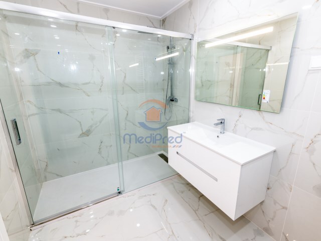 - Casas de banho: base de duche com resguardo, sanita suspensa da Roca com tampa de queda amortecida, toalheiro eléctrico, móvel suspenso com lavatório e espelho;