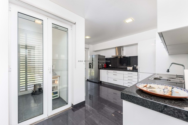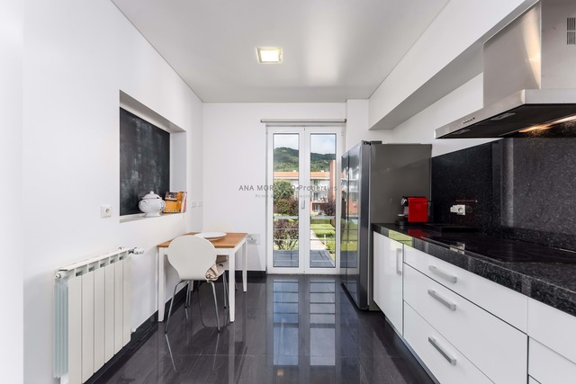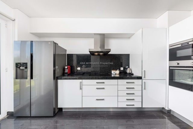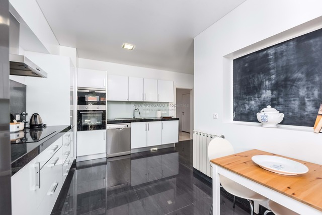 A cozinha, com design funcional e contemporâneo, está totalmente equipada com caldeira, fogão, exaustor, micro-ondas, forno elétrico, frigorífico, máquina de lavar loiça e conta ainda com uma zona de lavandaria independente.
