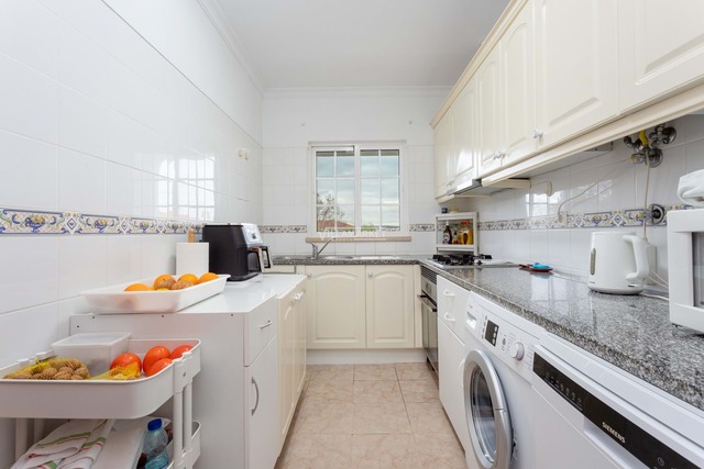 Todas as divisões do apartamento, incluindo a cozinha, oferecem vistas agradáveis para as muitas árvores que rodeiam o edifício.