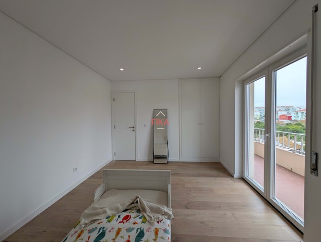 Um dos quartos com quase 30 m² um espaço raro num T2 com roupeiro embutido e ainda área suficiente para criar zona de trabalho, leitura ou até um segundo closet, sem comprometer a fluidez do quarto.