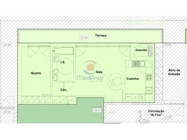 Dispõe de sala e cozinha em open space totalizando uma área de 32 m2, cozinha totalmente equipada - frigorífico, placa, forno, exaustor, máquina de lavar loiça e máquina de lavar roupa.