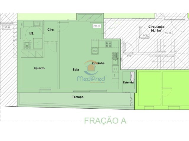 Conta com um quarto de 12,5 m2, roupeiro embutido WC completo.