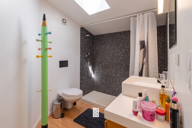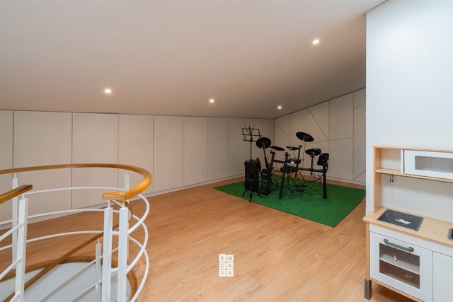 O piso superior oferece um espaço versátil e diferenciado, composto por uma suíte, um escritório amplo e grandes áreas de arrumos, perfeito para quem trabalha a partir de casa ou procura zonas adicionais bem organizadas.