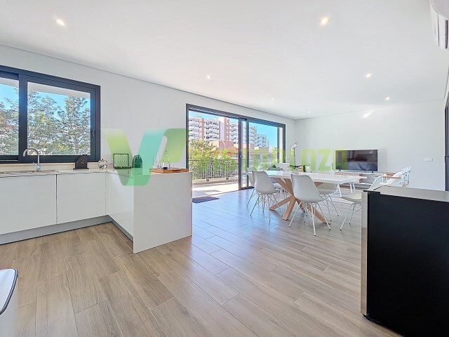 Inserido num edifício contemporâneo de 2019 com 2 elevadores, o apartamento oferece uma excelente distribuição: hall de entrada com roupeiro, sala e cozinha em open space com eletrodomésticos embutidos, despensa e bancada tipo península. Ambos os quartos têm roupeiros embutidos e acesso à varanda com vista para o rio; a suíte dispõe de uma casa de banho com duche, enquanto a segunda casa de banho inclui banheira.