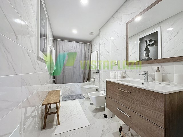 Composto por dois quartos, um deles em suíte, duas casas de banho (uma com banheira e outra com poliban), cozinha totalmente equipada, sala com ar-condicionado, e varanda espaçosa. Inclui ainda painéis solares, piso radiante nas casas de banho, roupeiros embutidos, estores elétricos e vidros duplos, garantindo eficiência e conforto em todas as estações do ano.