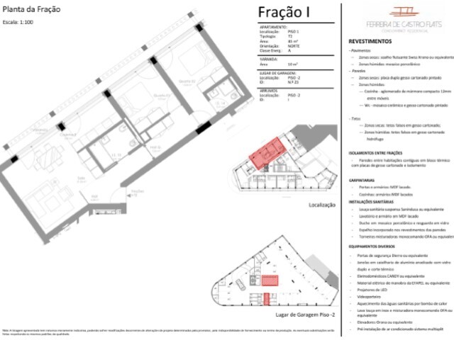 Acabamentos de qualidade: soalho flutuante: louça sanitária suspensas Sanindusa; porta segurança Dierre ou equivalente, caixilharia com vidro duplo; cozinhas equipadas com eletrodomésticos Balay ou equivalente; painéis solares para aquecimento de aguas;