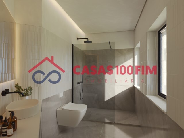 A instalação sanitária combina paredes pintadas com elementos em mármore, pavimento em mármore/cerâmico, base de duche em resina, misturadora termostática de parede Bruma Lusitano, sanitários Sanindusa e iluminação LED, garantindo conforto e durabilidade.