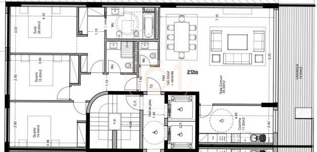 Com 1 suite com closet e dois quartos apoiados por 1 casa de banho, este apartamento tem uma sala de estar e jantar comum muito ampla, virada a Sul e cozinha. A zona social e de serviço tem acesso a uma varanda com 19,90 m2. Um lavabo social