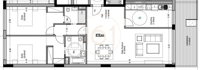 Com 2 suites com closet, este apartamento tem uma sala de estar e jantar comum muito ampla, virada a Sul e cozinha. A zona social e de serviço tem acesso a uma varanda com 14,40 m2.