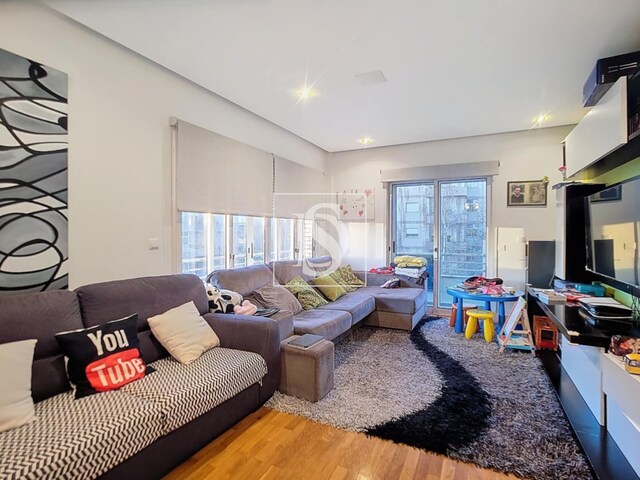 A sala de estar e jantar é ampla, luminosa e extremamente confortável, com acesso direto a uma varanda generosa que funciona como um verdadeiro prolongamento da zona social perfeita para refeições ao ar livre, momentos de lazer ou simplesmente para desfrutar da luz natural.