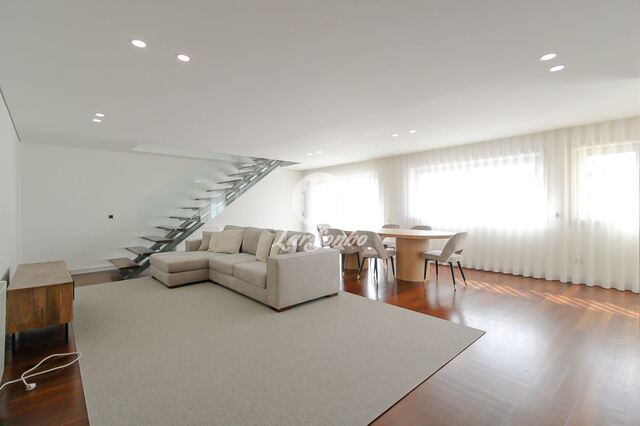 Inserida num 4º e 5º andar de um prédio com elevador. Constituída por 4 quartos sendo um deles suíte, cozinha em openspace, sala ampla de 60m2 e 3 WC's completos, no 4º andar, mais uma sala, 1 suíte, WC completo no 5º andar e garagem fechada para 2 carros.