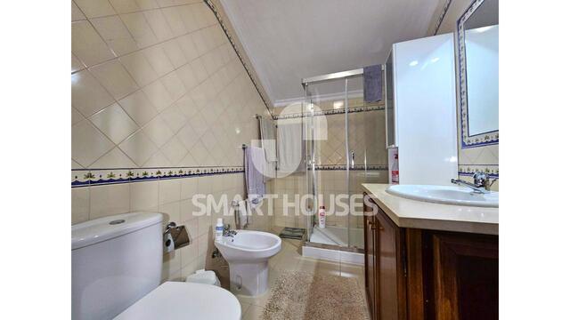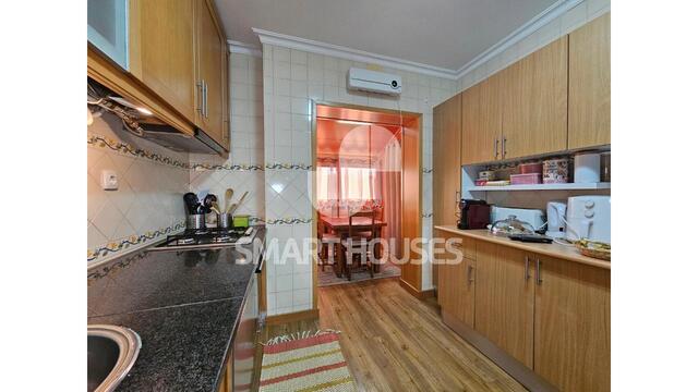 Cozinha com área de refeições separada, equipada com placa, forno, exaustor, esquentador com ligação a painel solar para aquecimento de água. Área anexa destinada a lavandaria e máquinas.