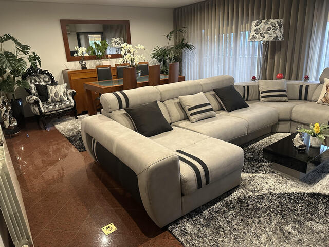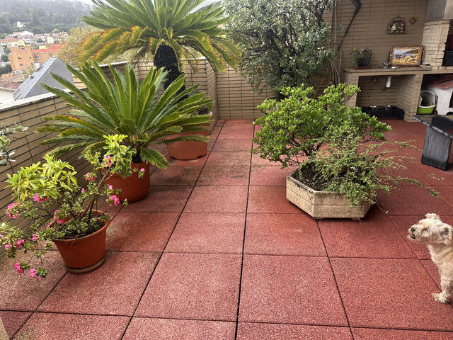 Tem um terraço com cerca de 75 m2. Está equipado com barbecue. Está dividido com zona de convívio e zona de lazer,