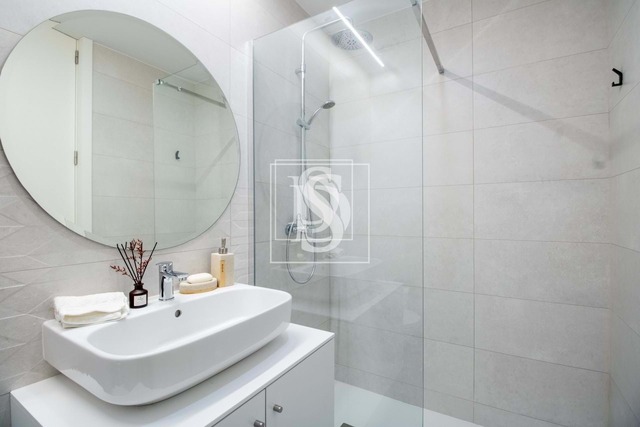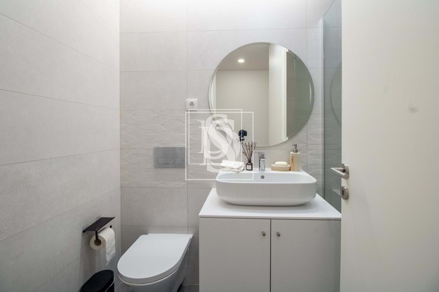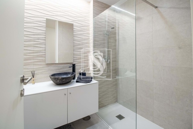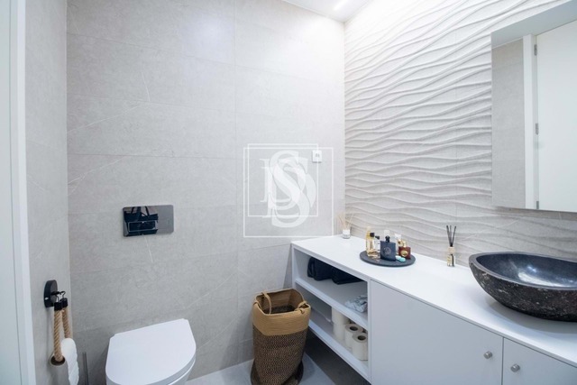 A casa de banho apresenta um estilo atual e sofisticado, com materiais de excelente qualidade.