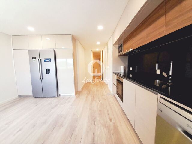 Cozinha equipada com 18m² (placa e forno, microondas, exaustor, frigorífico americano, máquina de lavar loiça, móveis em placado)