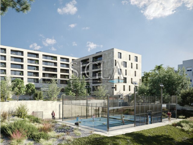 Condominio fechado com jardim privado, campo de padel, piscina e sala de condomínio.