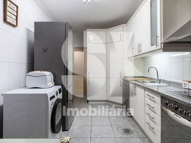 A cozinha, também ela de dimensões muito generosas, apresenta extensa bancada em pedra, excelente capacidade de arrumação e zona de refeições.