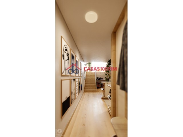 Acabamentos (sem marcas): soalho de carvalho maciço em sala, quarto e cozinha; paredes/tetos em gesso cartonado pintado em tons claros; cozinha com mobiliário em acabamento madeira e bancada em pedra composta; I.S. com pavimento em terrazzo polido, lambrim em grés porcelânico e iluminação LED.