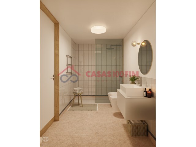 Acabamentos (sem marcas): soalho de carvalho maciço em sala, quarto e cozinha; paredes/tetos em gesso cartonado pintado em tons claros; cozinha com mobiliário em acabamento madeira e bancada em pedra composta; I.S. com pavimento em terrazzo polido, lambrim em grés porcelânico e iluminação LED.
