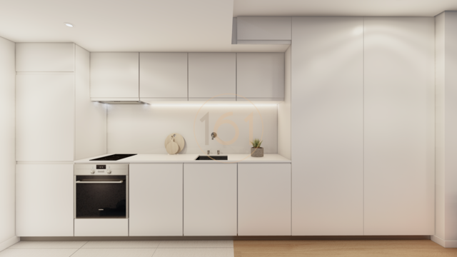 - Cozinha equipada com: Frigorifico, placa, forno, exaustor e pré-instalação para máquina de lavar roupa