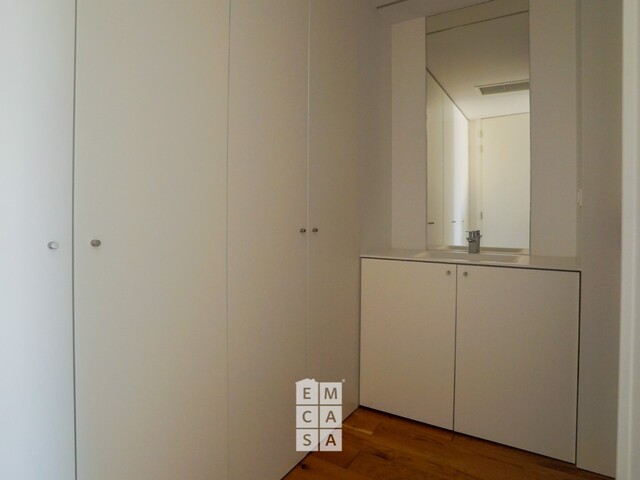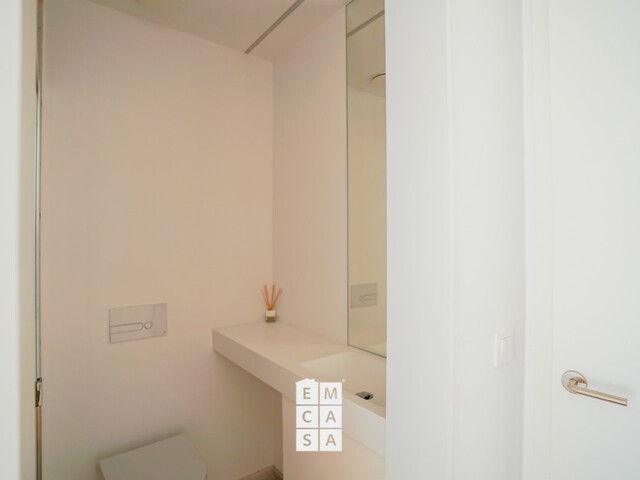 Materiais de topo: acabamentos premium como Mármore de Estremoz nas casas de banho, tampos em Corian, carpintaria lacada a branco com portas até ao teto e soalhos em madeira natural multicamada com acabamento em carvalho.