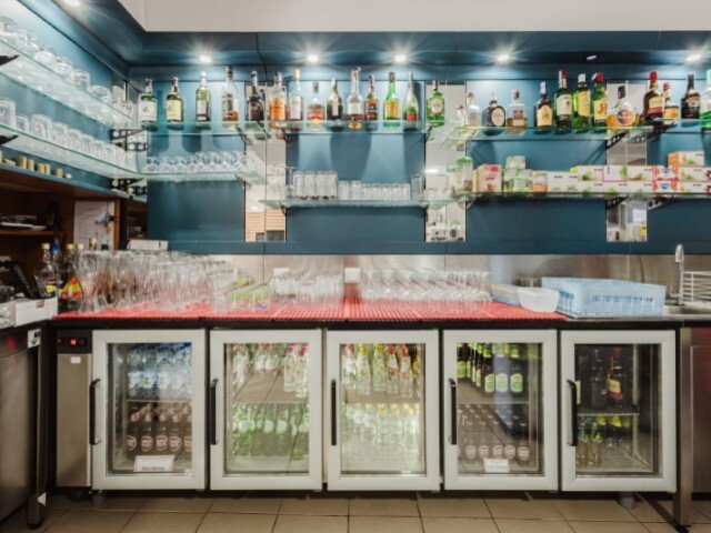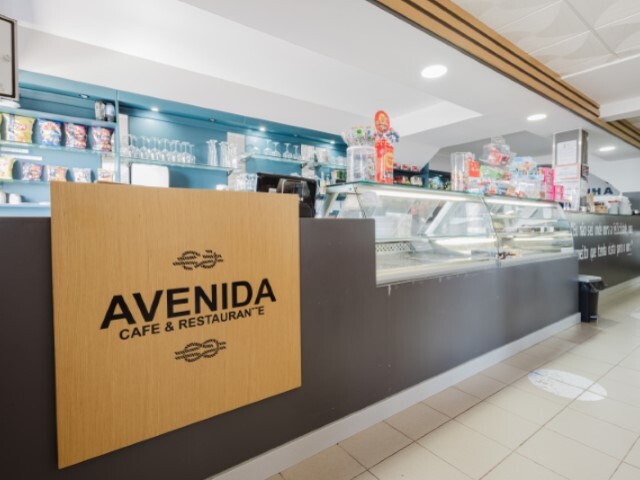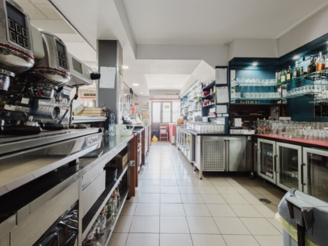 O balcão equipado com arcas de refrigeração de bebidas, máquina de café, vitrines de exposição de comida/bebida, máquina de lavar louça, zona específica de preparação de alimentos rápidos c/ tostadeira, torradeira, microondas.