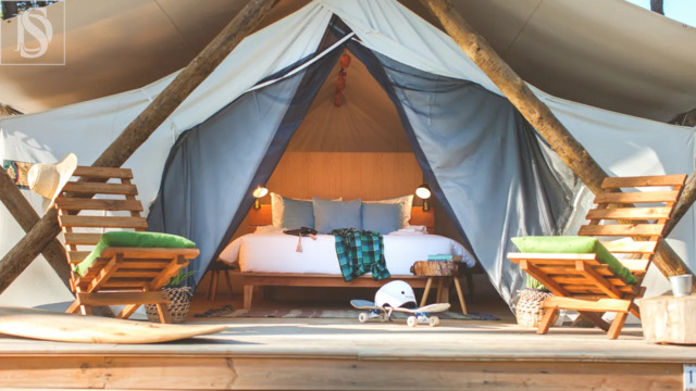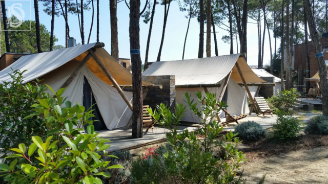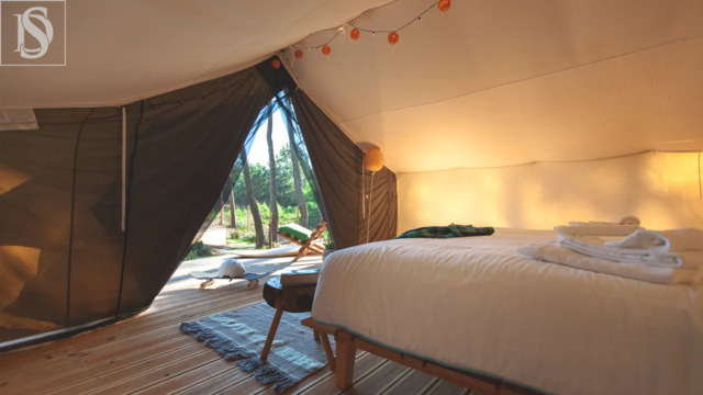 - Dezanove tendas canadenses, cada uma acomodando 2 a 4 pessoas. As tendas, feitas de tecido de algodão impermeabilizado e cobertas por uma camada adicional do mesmo material, estão erguidas sobre um deck de madeira, proporcionando uma experiência de glamping simples, mas confortável, com cama, mobiliário artesanal, aquecedores e acesso aos balneários.