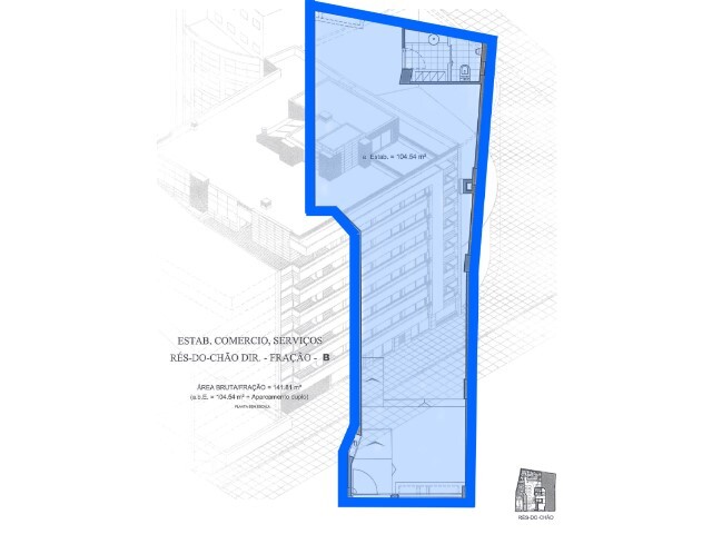 Com 104,54 m2 de área útil, esta loja ampla, licenciada para comércio e serviços, conta com instalação sanitária e garagem fechada para dois automóveis na cave.