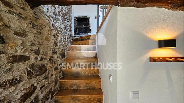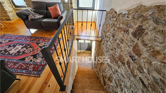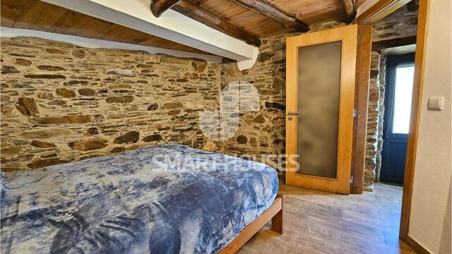 - No 1º andar tem salão amplo, com zona de estar, zona de refeições e cozinha completamente equipada; daqui acede-se a varanda voltada a Sul, com vistas sobre a aldeia, e com churrasqueira.
