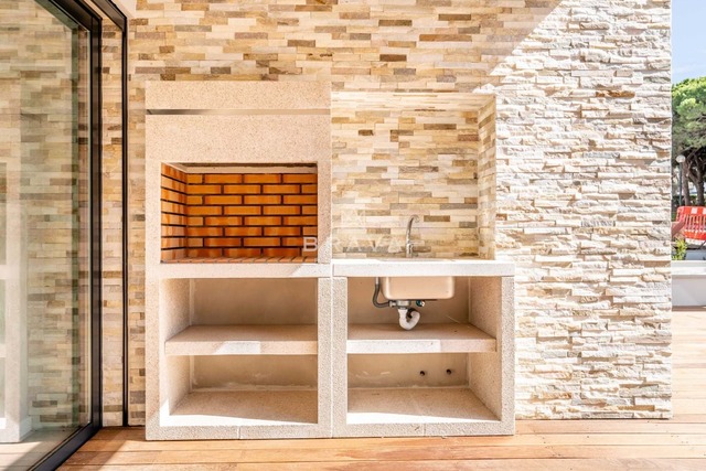 O exterior conta com piscina de água salgada, solário, jardim envolvente e zona de refeições com barbecue.