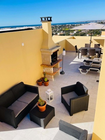 Terraço na cobertura: churrasqueira, zona de refeições ao ar livre e vista panorâmica sobre o mar perfeito para churrascos, convívio ou simplesmente apreciar o pôr do sol.