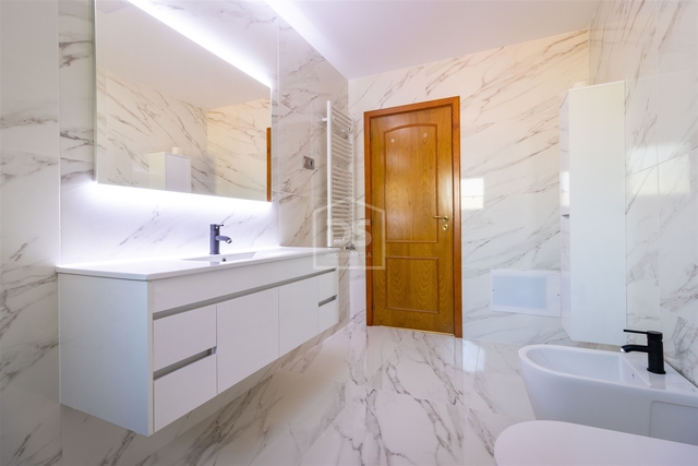 A garagem, com capacidade para 3 carros, oferece comodidade e segurança para os veículos da família. Já o exterior da propriedade é um verdadeiro paraíso privado, com uma zona de convivência perfeita para relaxar ou receber visitas. A área dispõe de um barbecue, ideal para refeições ao ar livre, e uma piscina, onde pode desfrutar de momentos de lazer enquanto aprecia a tranquilidade do ambiente envolvente. O pomar e o jardim circundante, iluminado durante a noite, criam um ambiente mágico, ideal para passeios relaxantes ou momentos de contemplação.