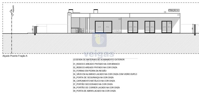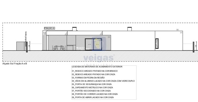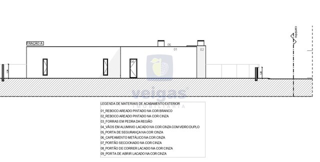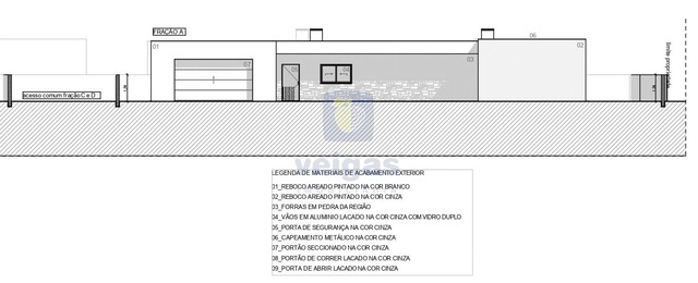 Construção em alvenaria com tijolo térmico 25mm, isolamento capoto 8 cm, paredes interiores com tijolo 11 revestido a reboco projetado; tetos falsos com isolamento lã de rocha e projetores led embutidos; caixilharia em alumínio termo-lacados com vidro duplo e corte térmico; muro exterior com tijolo de 15, a fechar a propriedade , com altura de 1,5m atrás e laterais, na frente com 1 , rebocado e pintado.