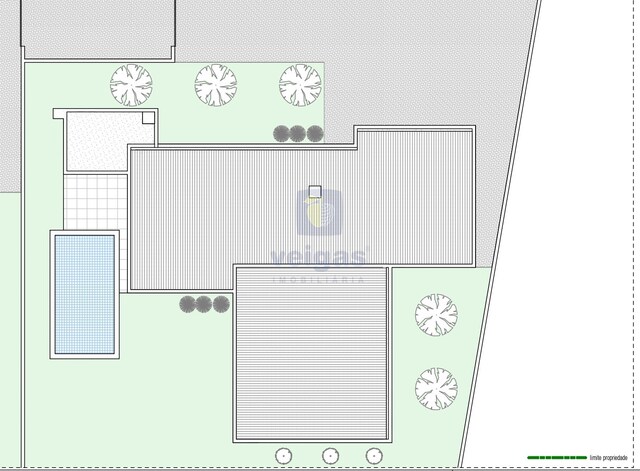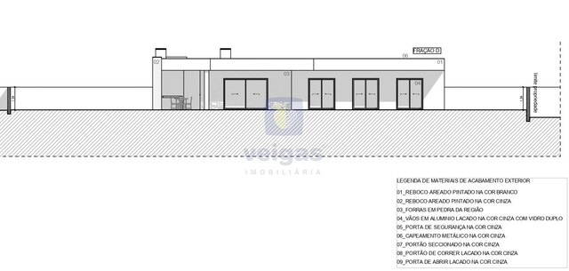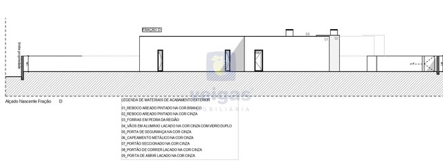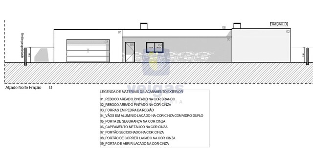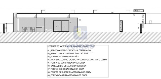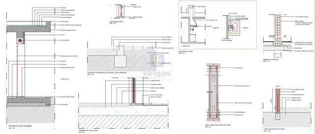Construção em alvenaria com tijolo térmico 25mm, isolamento capoto 8 cm, paredes interiores com tijolo 11 revestido a reboco projetado; tetos falsos com isolamento lã de rocha e projetores led embutidos; caixilharia em alumínio termo-lacados com vidro duplo e corte térmico; muro exterior com tijolo de 15, a fechar a propriedade , com altura de 1,5m atrás e laterais, na frente com 1 , rebocado e pintado.