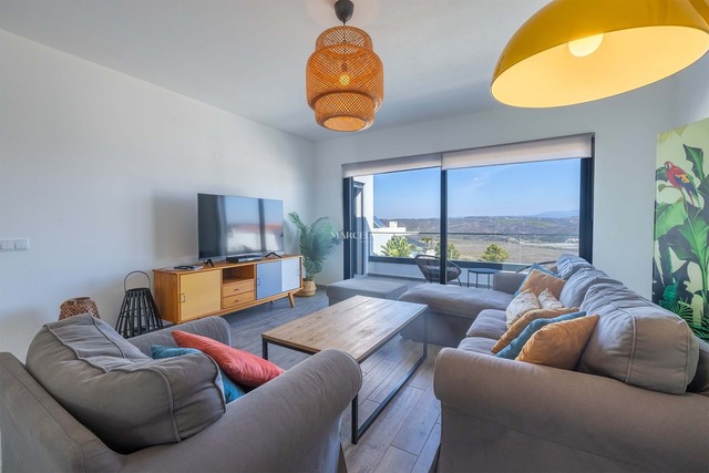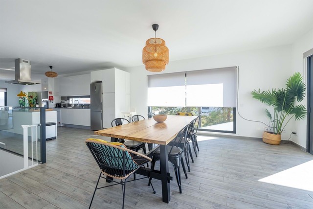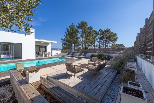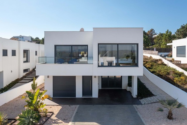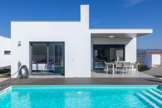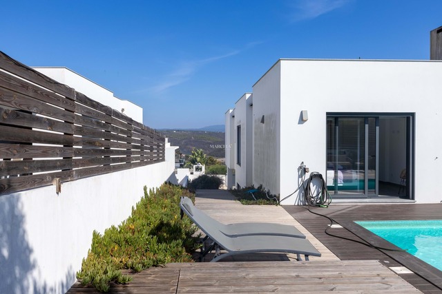 Fabulosa moradia moderna de dois pisos com 268m2 inserida num grande lote de terreno com 577,19m2, com três quartos em suite, casa de banho, piscina de água salgada , virada a sul, terraços e vista para a montanha.