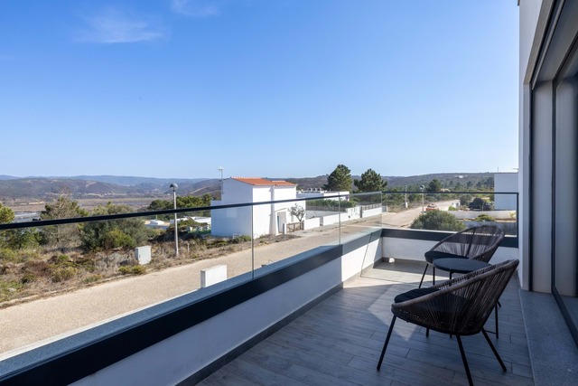 Piso superior - três quartos duplos com casa de banho privativa, generosa área de jantar/estar/cozinha em plano aberto com acesso aos terraços da frente e de trás e ao jardim das traseiras, vistas fabulosas a partir da área de estar sobre o Vale da Amoreira.
