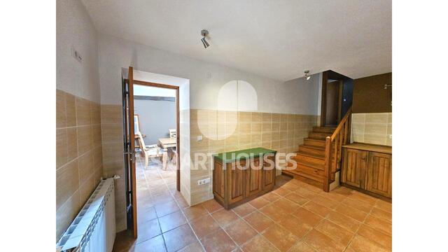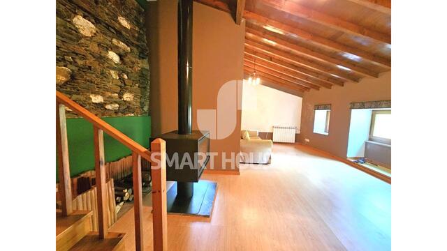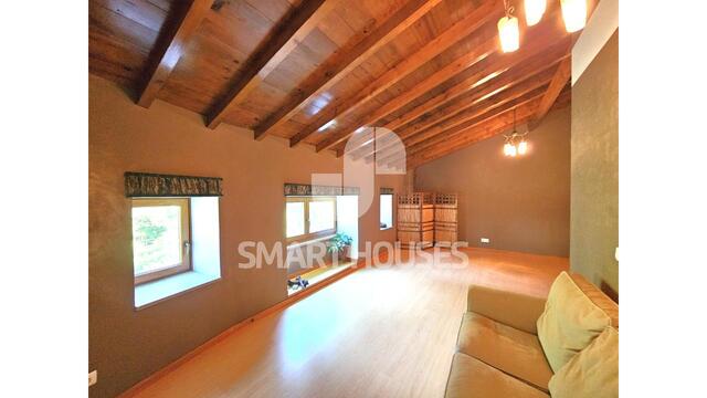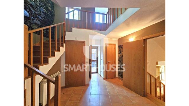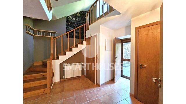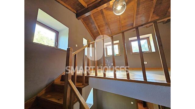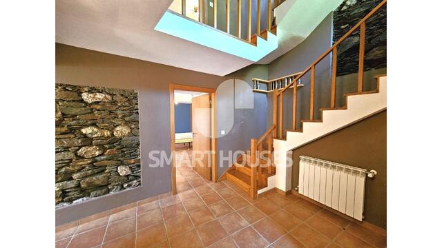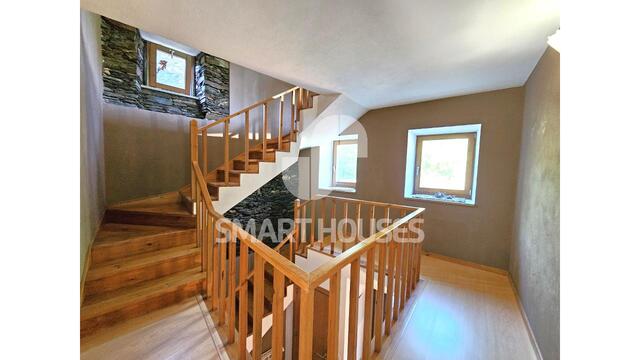 - Piso de entrada (1º andar): ao qual se acede através de amplo hall de entrada, com bengaleiro, e daqui para o escritório (ou quarto, já que a porta de entrada é isolada acusticamente, assim como o teto, com um segundo forro suspenso com isolamento de lã natural), para o WC de serviço e para a sala de estar, muito ampla, com salamandra a lenha, e ótimas vistas sobre o jardim e sobre a ribeira. Deste hall acede-se quer ao piso inferior, quer ao piso superior através de escadaria com bonito gradeamento em madeira.